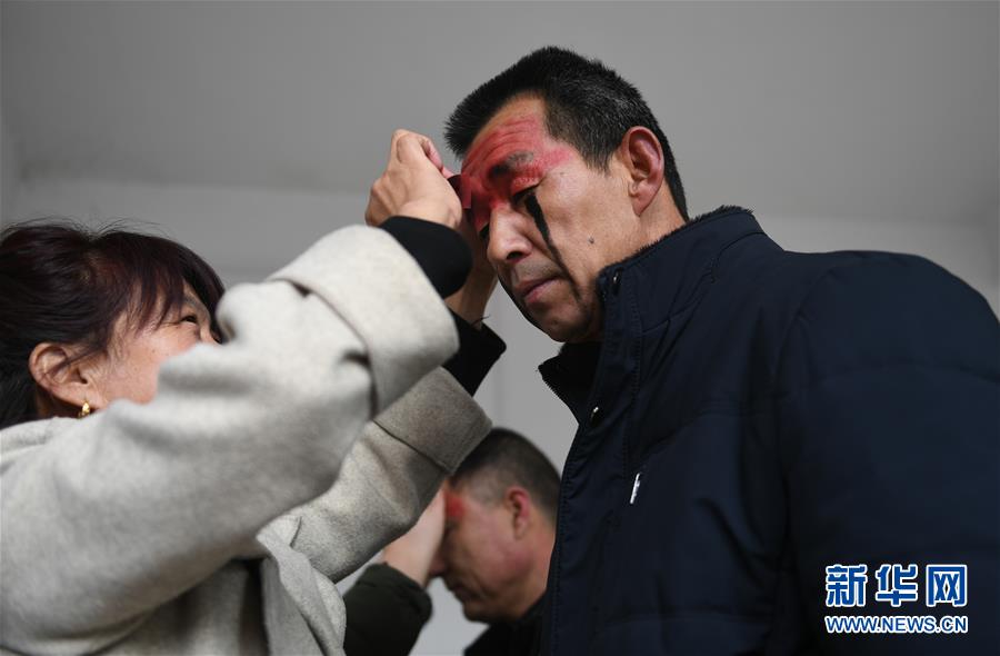 2月11日,北辛庄村民间艺人在表演“高跷走兽”前化装。当日,山西省运城市稷山县清河镇北辛庄村举办“高跷走兽”闹新春民间社火表演活动,众多村民前来观看。“高跷走兽”是当地特色民间表演艺术,表演时两人足踩高跷同演骑兽状,伴随着鼓乐声行进,演绎神话传说,表达当地百姓祈盼风调雨顺、五谷丰登的美好愿望。新华社发(栗卢建 摄)