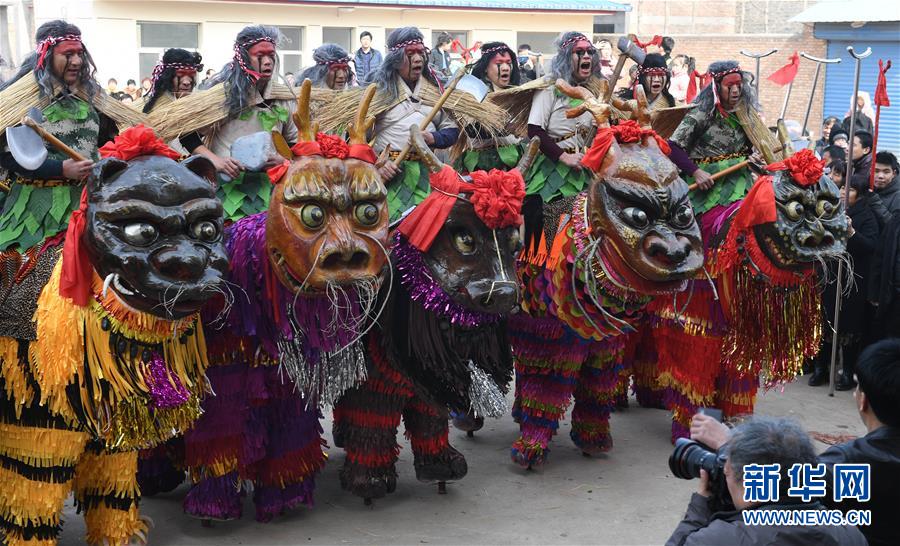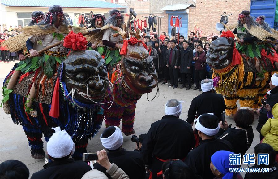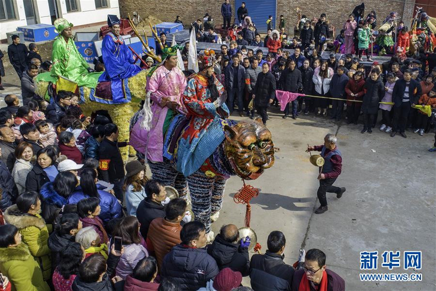 2月11日,北辛庄村民间艺人在表演“高跷走兽”。当日,山西省运城市稷山县清河镇北辛庄村举办“高跷走兽”闹新春民间社火表演活动,众多村民前来观看。“高跷走兽”是当地特色民间表演艺术,表演时两人足踩高跷同演骑兽状,伴随着鼓乐声行进,演绎神话传说,表达当地百姓祈盼风调雨顺、五谷丰登的美好愿望。新华社发(栗卢建 摄)