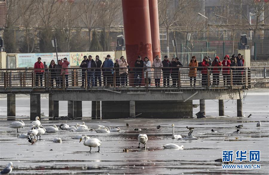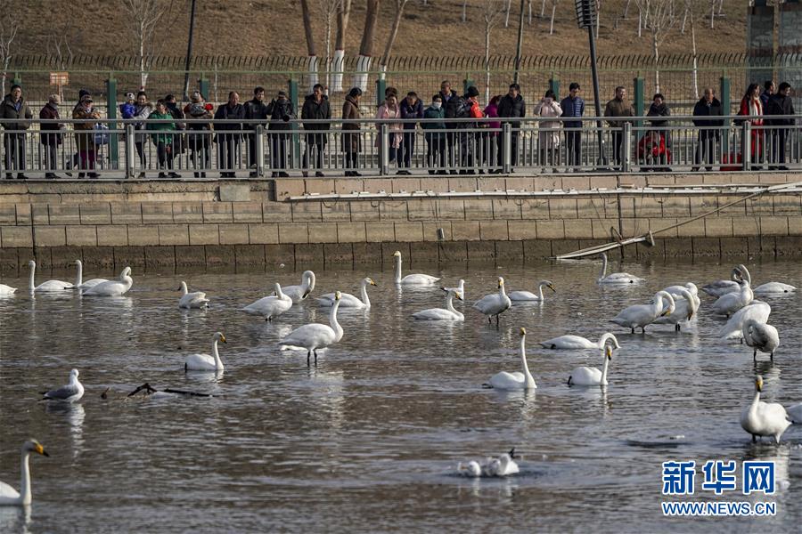 2月11日,在库尔勒市杜鹃河上栖息的天鹅引来市民驻足观赏。