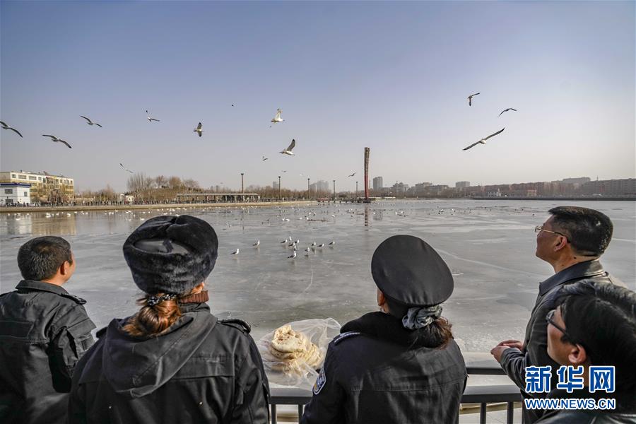 2月11日,库尔勒市园林绿化管理局监察大队天鹅中队的工作人员在查看天鹅的越冬情况。