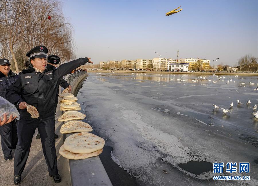 2月11日,库尔勒市园林绿化管理局监察大队天鹅中队监察员祖莱古丽·图尔逊(前)在投喂天鹅。