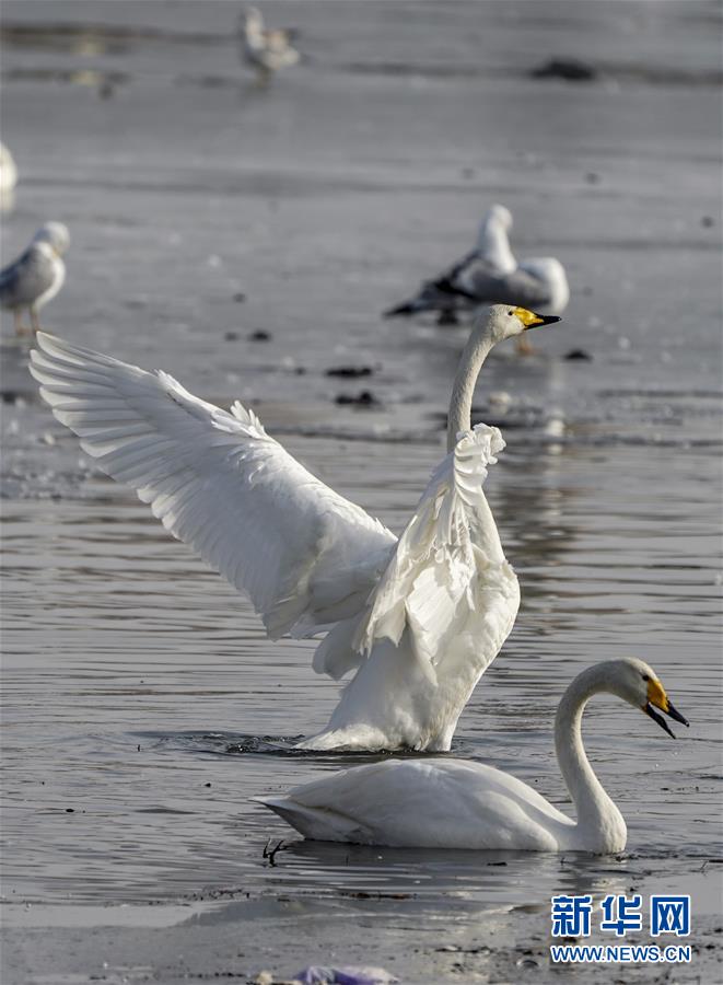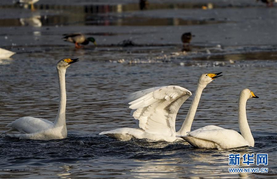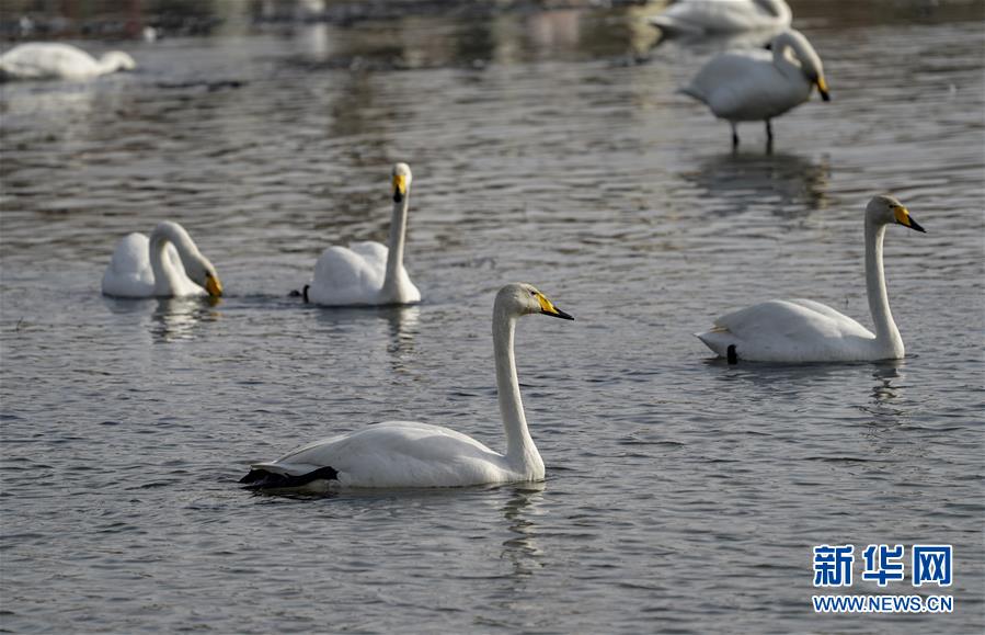 2月11日,天鹅在库尔勒市杜鹃河上嬉戏。