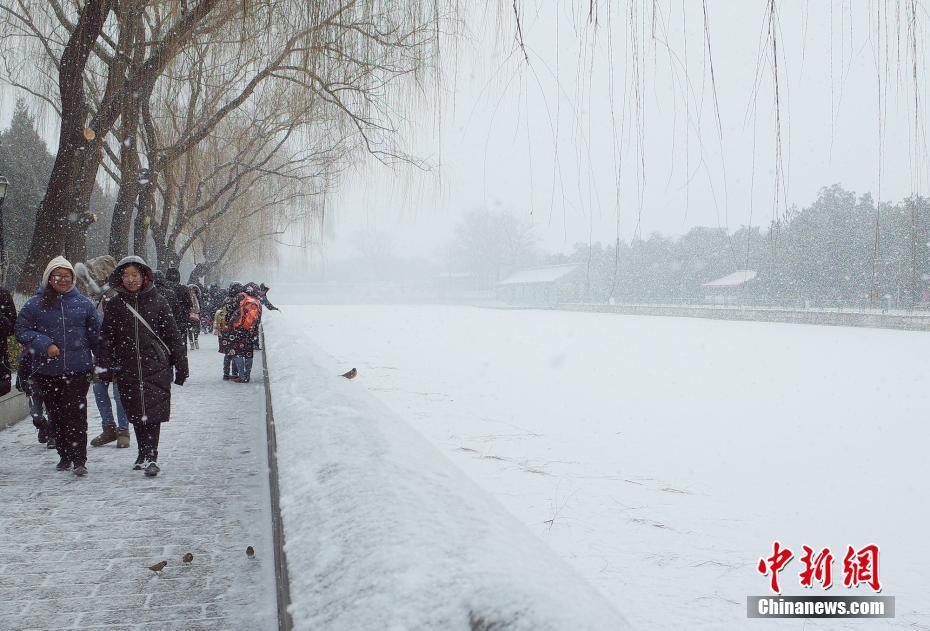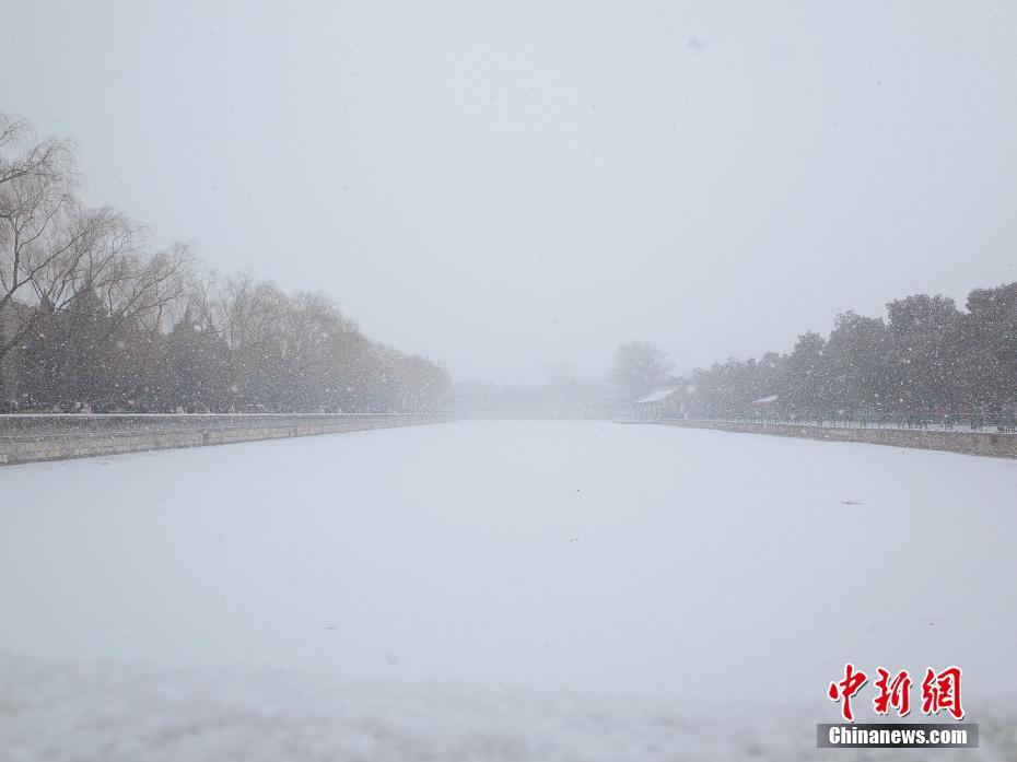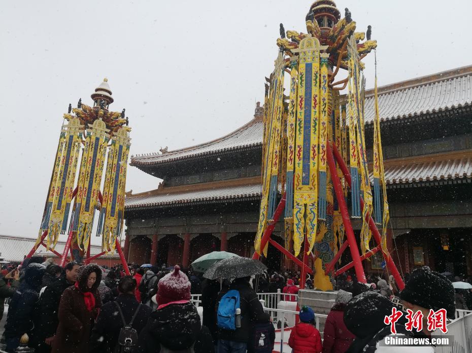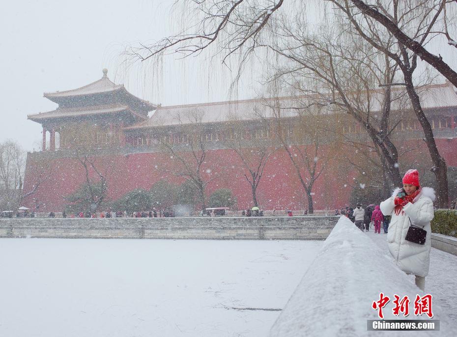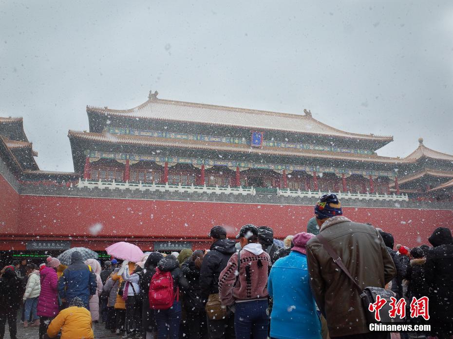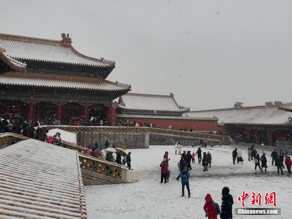 2月12日,北京城区迎来大规模降雪,众多游客到故宫打卡赏雪。宫殿上覆盖了一层白雪,人们兴致不减,纷纷拿起手机留下雪中紫禁城的美景。中新网记者 上官云 摄