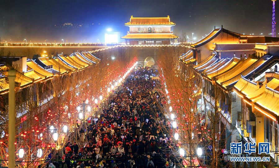 2月9日,游客在石家庄市正定古城夜游。