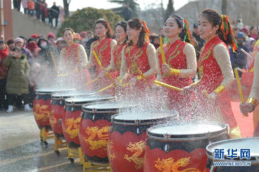 2月11日,在山东青岛崂山区王哥庄贺新春民间文艺展演活动上,社区居民表演《龙鼓闹春》。