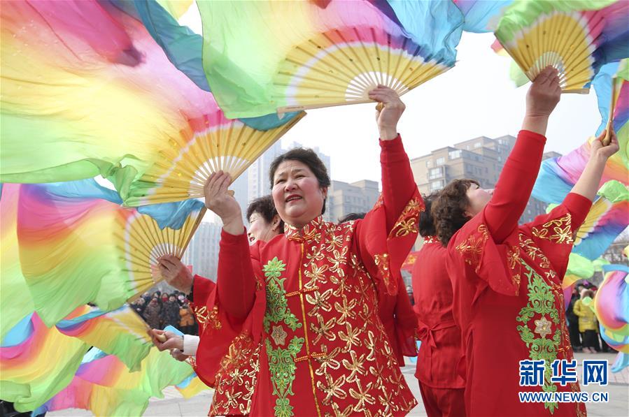 2月11日,一支秧歌队在山东省临沂市城邦广场进行表演。