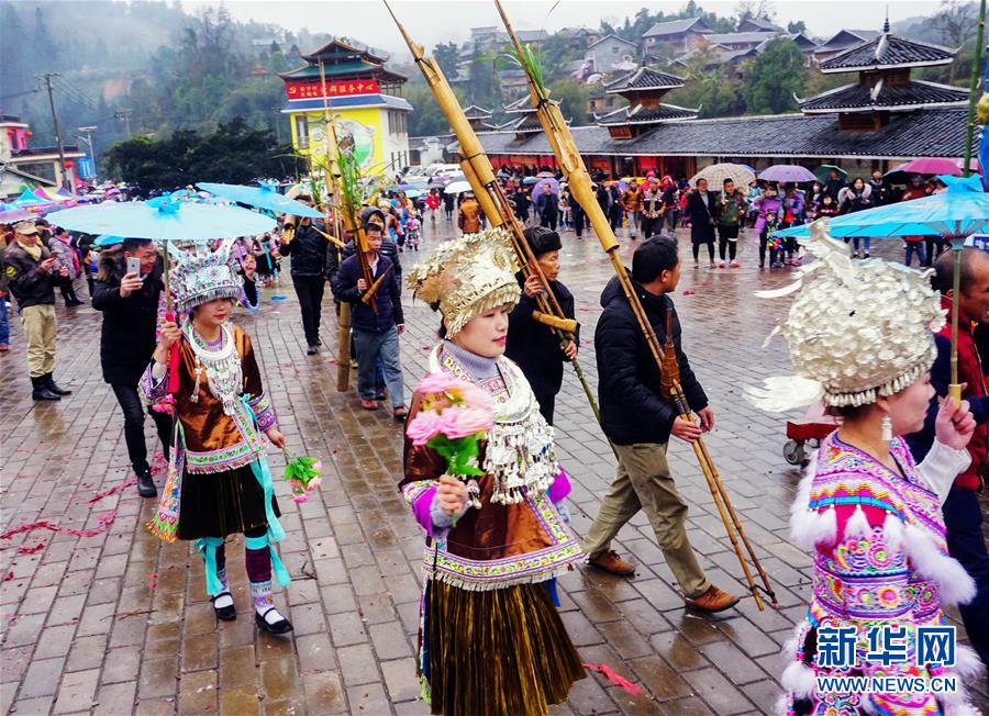 当日是农历正月初九,广西柳州市融安县长安镇安宁村大袍屯苗族群众欢庆传统节日“芒蒿节”,当地苗族青年装扮成“芒蒿”走街串户,向人们送去新春祝福。