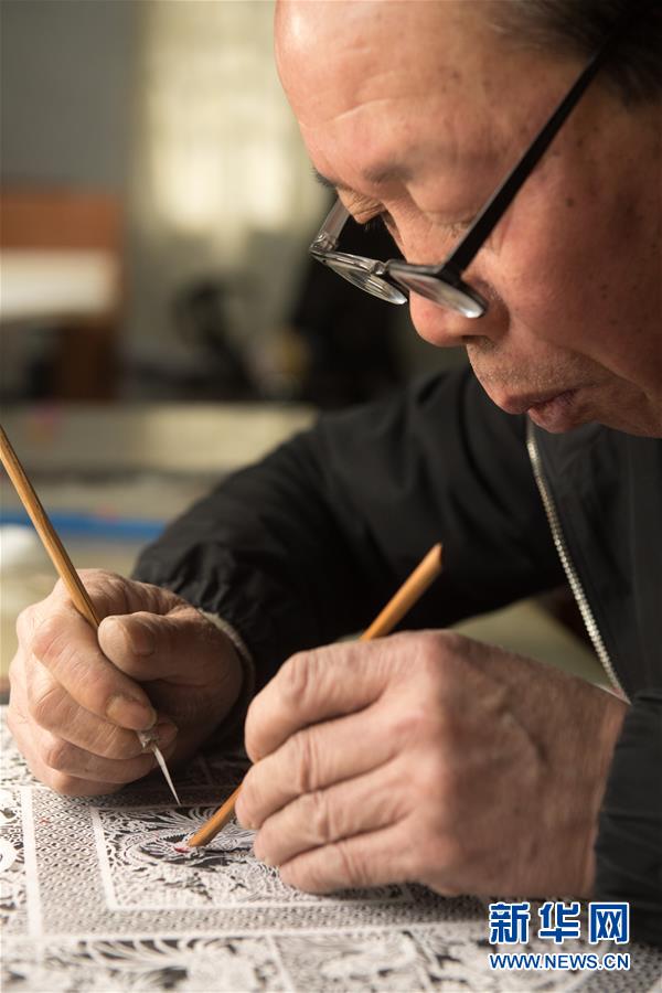 2月12日,在浙江省乐清市北白象镇,林顺奎在家中展示细纹刻纸的制作。 新华社记者翁忻旸摄