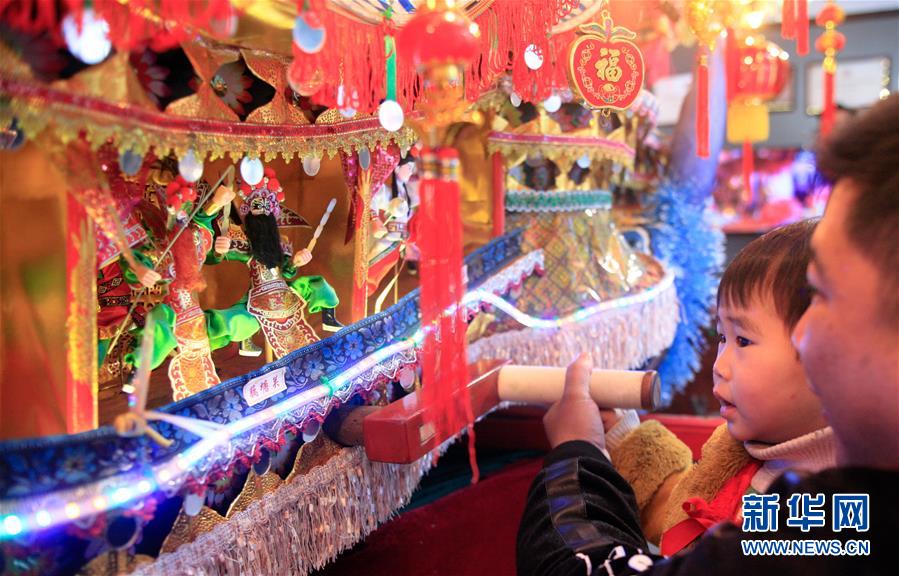 2月11日,在浙江省乐清市北白象镇,林顺奎的女婿黄孟抱着孩子摇动首饰龙的手柄。 新华社记者朱唯希摄