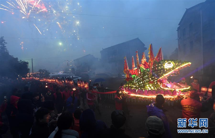 2月17日,村民舞起梅烛灯在锣鼓烟花中绕村游走。 当晚,江西省南昌市新建区石岗镇石岗村热闹非凡,村民舞起由1200多个花灯和400余条板凳灯连接而成的梅烛灯绕村游走,祈求风调雨顺、五谷丰登。 石岗梅烛灯也叫“板凳龙”,由青蛙龙灯头、龙身、龙尾组成。这个习俗在当地已流传了数百年,每年正月十三晚上举行,入选江西省省级非物质文化遗产名录。 新华社记者宋振平摄