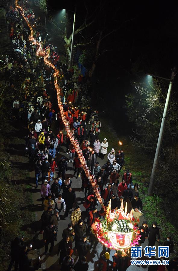 2月17日,村民舞起梅烛灯在锣鼓烟花中绕村游走。 当晚,江西省南昌市新建区石岗镇石岗村热闹非凡,村民舞起由1200多个花灯和400余条板凳灯连接而成的梅烛灯绕村游走,祈求风调雨顺、五谷丰登。 石岗梅烛灯也叫“板凳龙”,由青蛙龙灯头、龙身、龙尾组成。这个习俗在当地已流传了数百年,每年正月十三晚上举行,入选江西省省级非物质文化遗产名录。 新华社记者宋振平摄