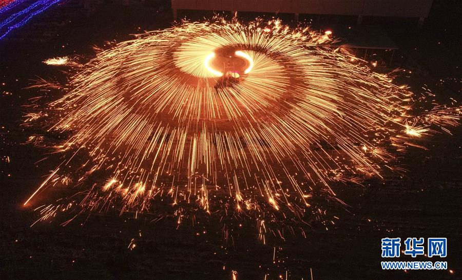 2月17日晚,民间艺人在进行“打树花”民俗表演(无人机拍摄)。 当晚,河北唐山遵化市团瓢庄乡山里各庄村花灯广场举行“打树花迎元宵”民俗表演,欢庆佳节。 新华社发(刘满仓 摄)