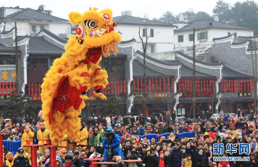 2月19日,在湖南省衡阳市南岳区万寿广场,民间艺人在表演舞狮。新华社发(曹正平 摄)