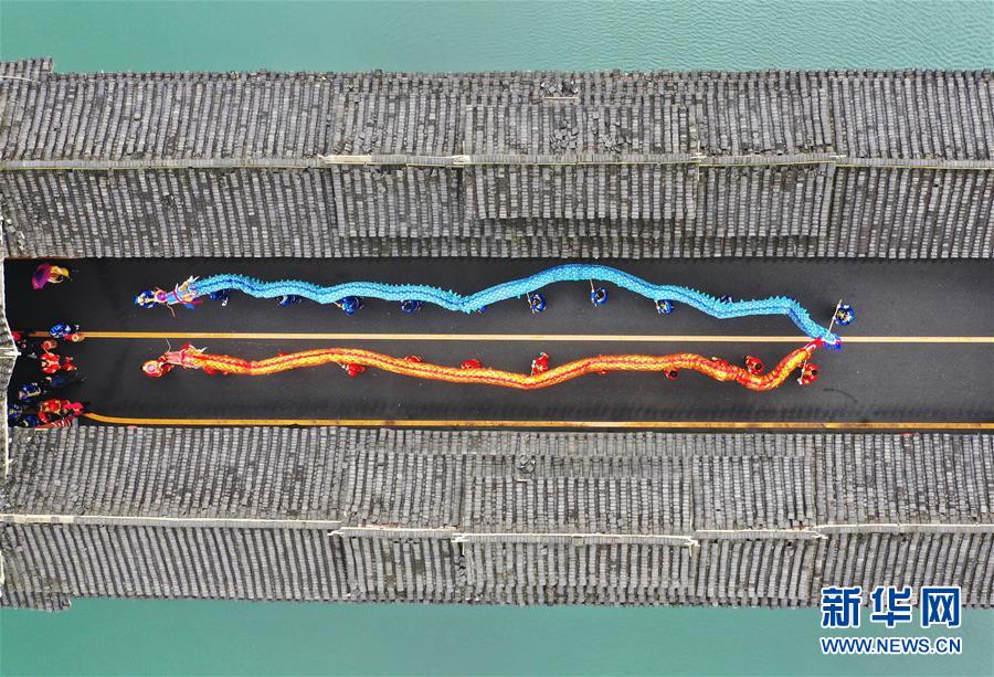 2月19日,民间艺人在贵州省铜仁市玉屏侗族自治县风雨桥上进行舞龙表演(无人机拍摄)。新华社发(胡攀学 摄)