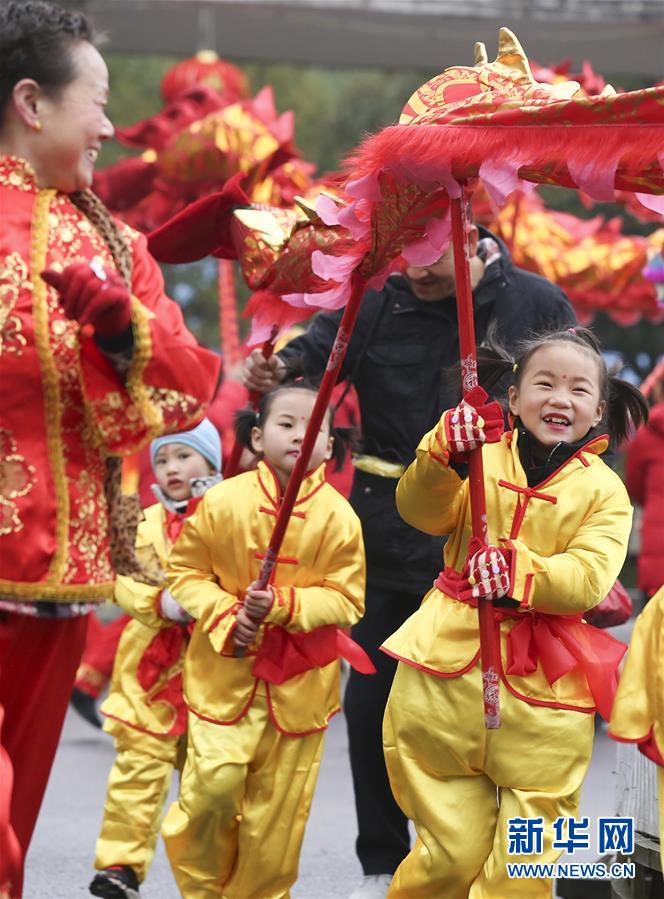 2月19日,小朋友在湖南资兴市举行的龙狮腰鼓闹元宵活动中表演。 新华社发(肖晨威 摄)
