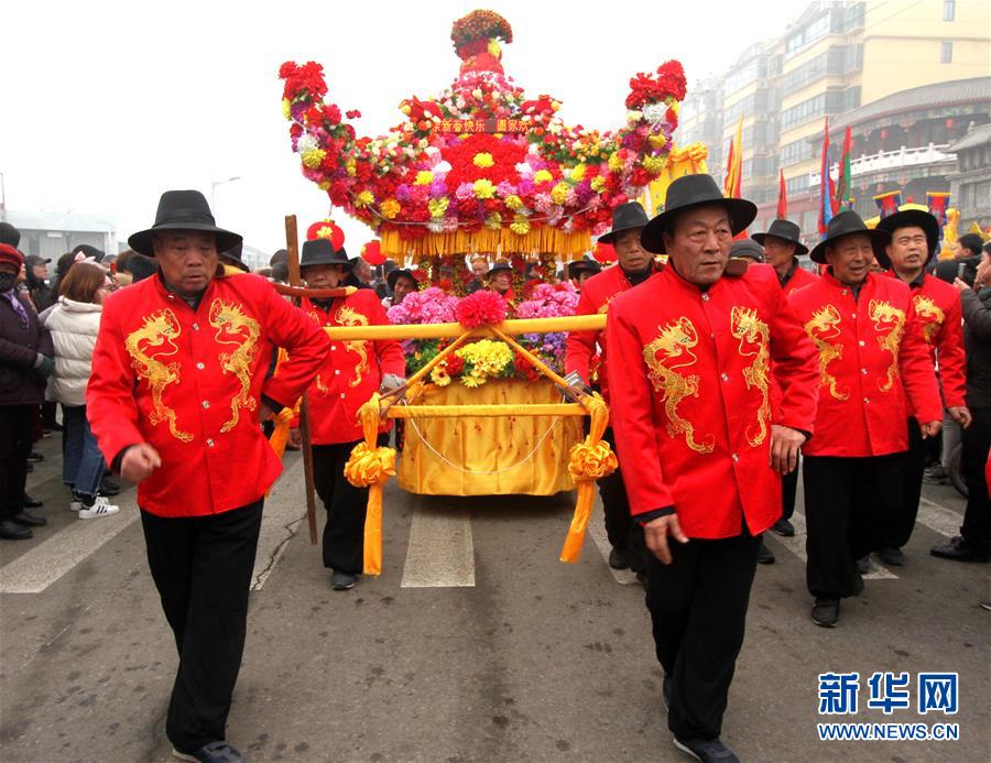 2月19日,在河北省邯郸市永年区临洺关镇,民间艺人在表演“抬花桌”。 新华社发(胡高雷 摄)