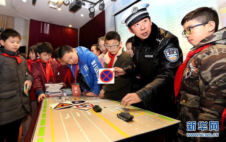 2月20日,在上海市虹口区第六中心小学,交警向学生讲解交通安全知识。 新华社记者 凡军 摄