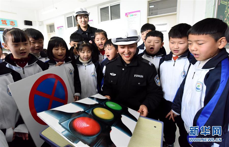 2月20日,在河北省文安县第四小学,交警向学生讲解交通标志。 新华社记者 王晓 摄