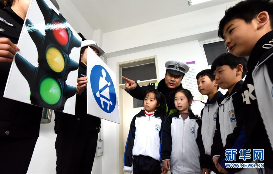 2月20日,在河北省文安县第四小学,交警向学生讲解交通标志。 新华社记者 王晓 摄