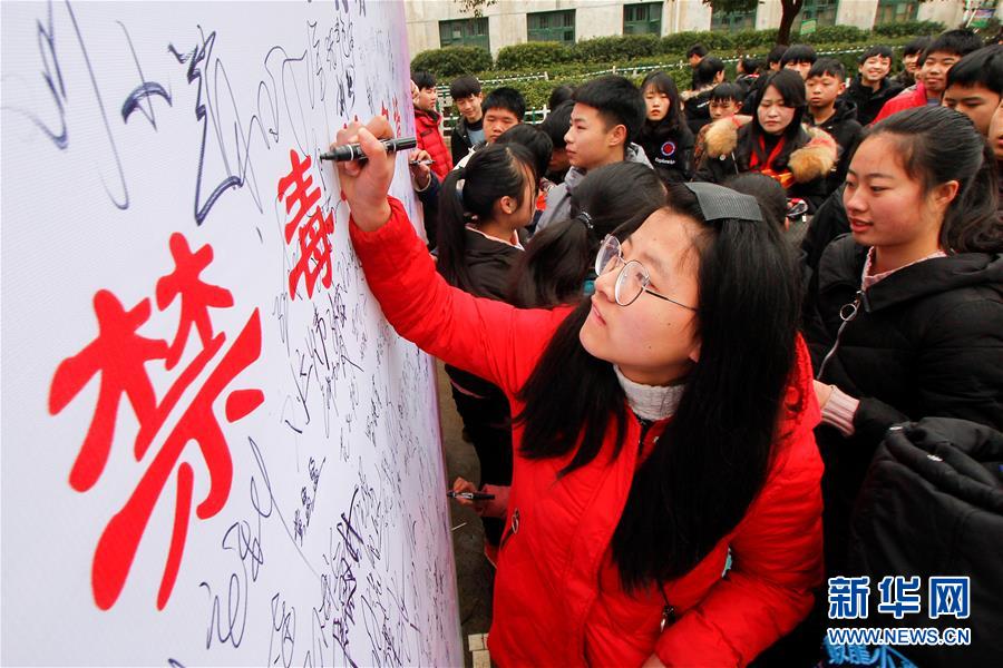 2月20日,湖南省邵阳市隆回县三阁司镇中学举办以禁毒教育为主题的开学第一课。这是学生们在禁毒教育签名墙上签名。 新华社发(曾勇 摄)