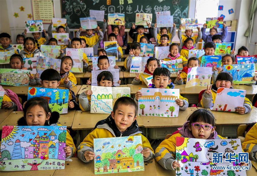2月21日,河北省大厂回族自治县城区二小一年级四班的孩子们在展示自己绘制的家乡美景。 连日来,河北省多所中小学迎来春季开学。大厂回族自治县城区二小开展了以“画出我们最爱的家乡”为主题的“开学第一课”活动,孩子们在老师的指导下把对家乡的热爱倾注在手中的五彩画笔中,描绘出心中最美的家乡风景,抒发对祖国、对家乡的无限热爱。 新华社记者李晓果摄