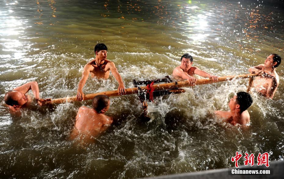 2月21日晚,福建省长泰县岩溪镇珪后村举办一年一度的省级非物质文化遗产“三公下水操”民俗活动,弘扬“忠义勇”的爱国精神,极具特色。“三公下水操”是长泰县岩溪镇珪塘叶氏家族为纪念文天祥、张世杰、陆秀夫这“宋代三杰”,于每年农历正月十七傍晚举行的一项民俗活动,至今已有500多年历史。中新社记者 张金川 摄