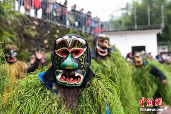 一名儿童戴着五官扭曲的“芒篙”面具巡游。王以照 摄
