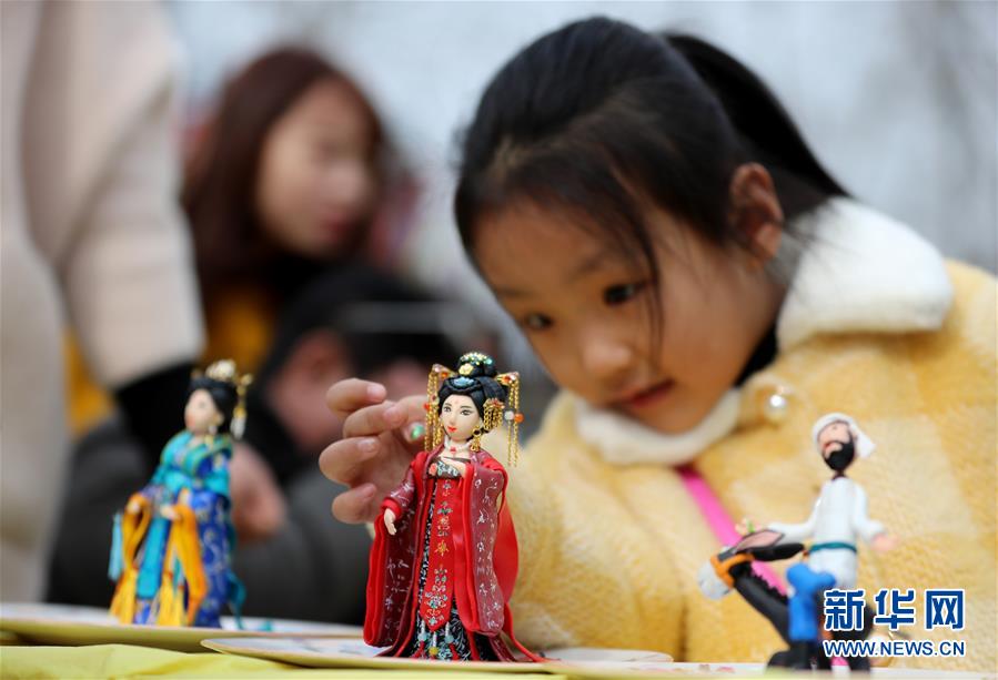 2月22日,一名小朋友在观看面塑作品。 当日,河北省石家庄市井陉县秀林镇南张村举办一年一度的面塑展。工艺精湛、色彩缤纷的面塑工艺品吸引了众多游客来前观看。南张村面塑2011年入选河北省非物质文化遗产名录。 新华社发(王保龙 摄)