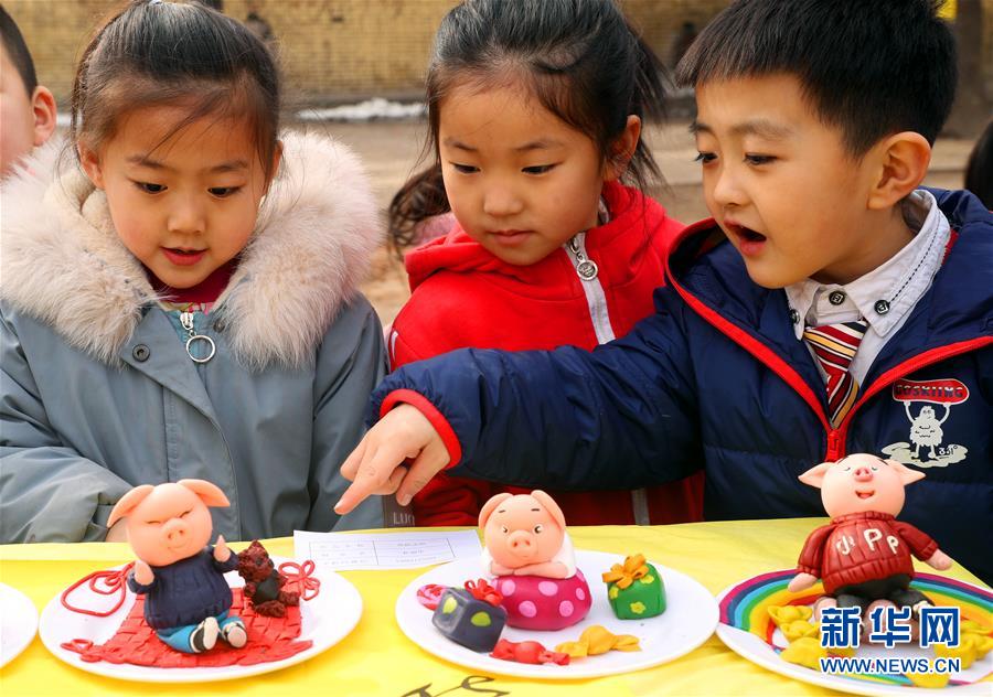 2月22日,三名小朋友在观赏以猪为主题的面塑作品。 当日,河北省石家庄市井陉县秀林镇南张村举办一年一度的面塑展。工艺精湛、色彩缤纷的面塑工艺品吸引了众多游客来前观看。南张村面塑2011年入选河北省非物质文化遗产名录。 新华社发(张秀科 摄)