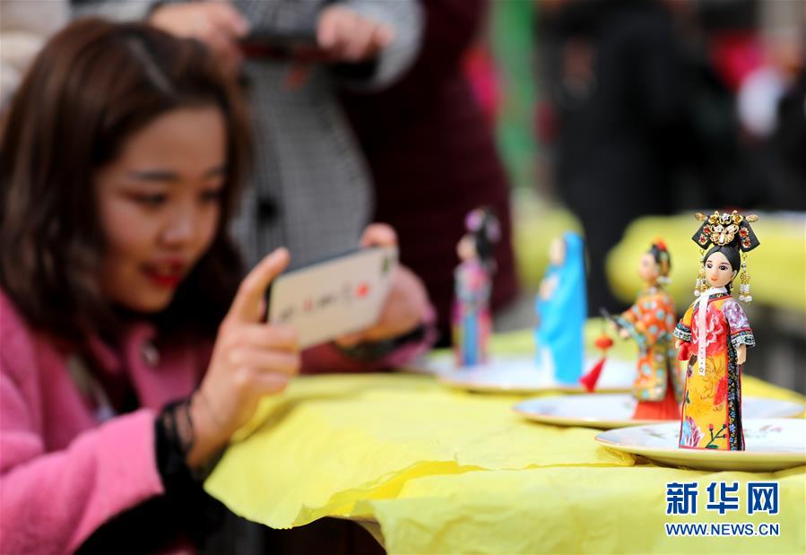 2月22日,一名游客在拍摄展出的面塑作品。 当日,河北省石家庄市井陉县秀林镇南张村举办一年一度的面塑展。工艺精湛、色彩缤纷的面塑工艺品吸引了众多游客来前观看。南张村面塑2011年入选河北省非物质文化遗产名录。 新华社发(王保龙 摄)
