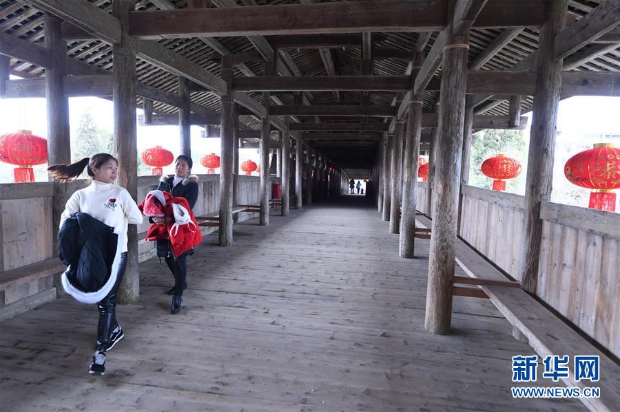 2月19日,游人从福建省屏南县棠口镇的千乘桥桥屋走过。 新华社记者 林善传 摄
