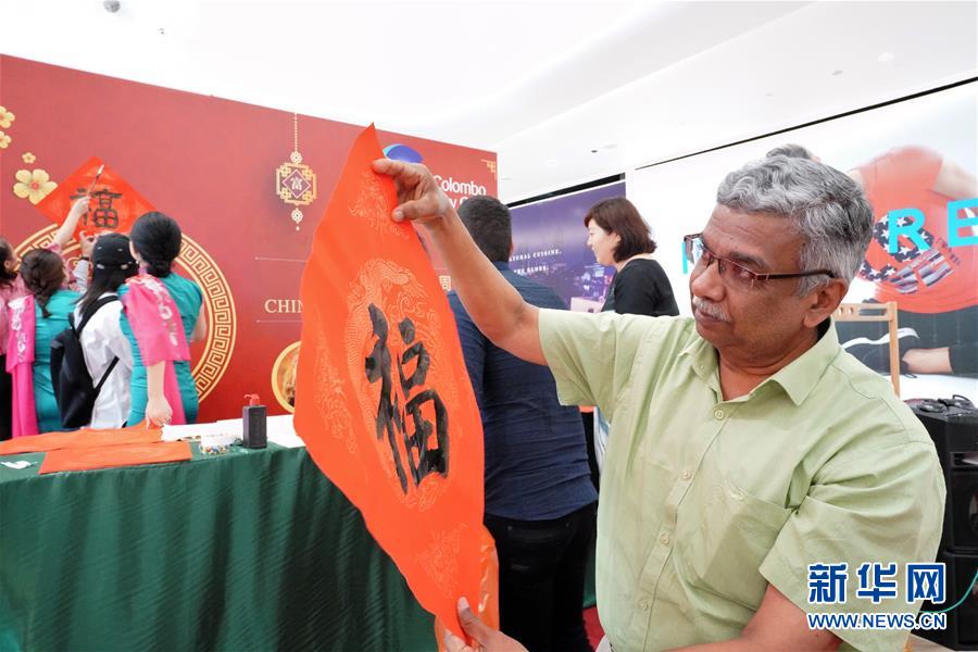 2月16日,在斯里兰卡科伦坡,一名男子在中国文化周活动上观赏收到的“福”字。 持续9天的中国文化周活动24日晚在斯里兰卡科伦坡落幕。饺子、元宵、剪纸、茶艺、书法、山水画、古筝、旗袍……每天都有不同的中国元素登场,吸引着当地民众和来自世界各地的游客。 新华社记者唐璐摄