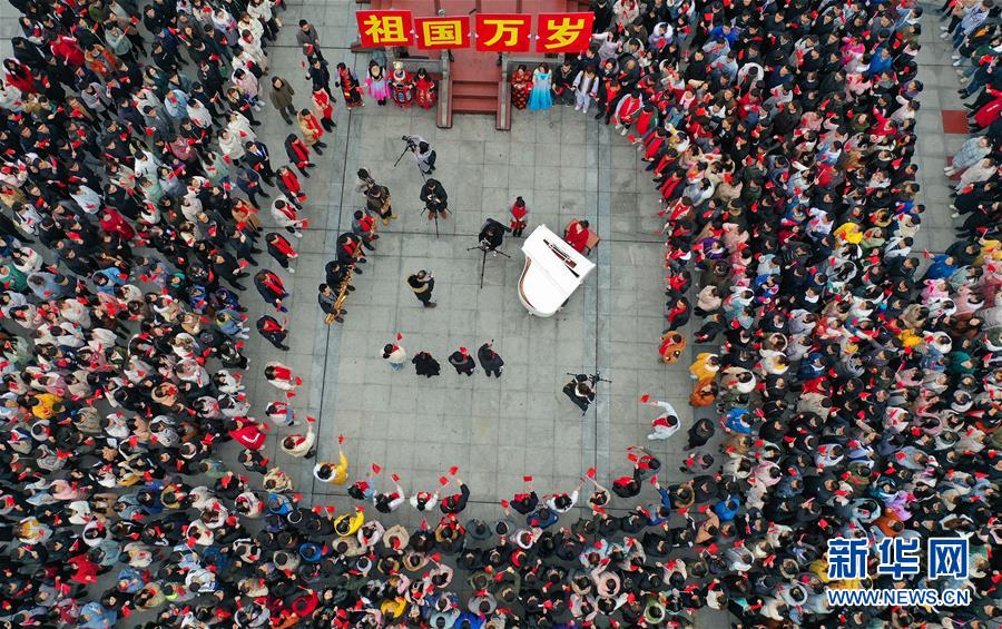 2月25日,湖南省衡阳市南华大学师生在开学主题活动上齐唱《我和我的祖国》(无人机拍摄)。 当日是我国部分地区的开学第一天,学生们在丰富多彩的活动中迎接新学期的到来。 新华社发(曹正平 摄)