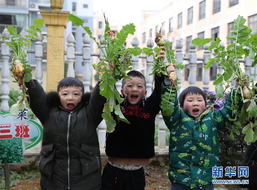 2月25日,在贵州省铜仁市玉屏侗族自治县平溪街道第二幼儿园,孩子们在开学主题活动上展示自己拔的萝卜。 当日是我国部分地区的开学第一天,学生们在丰富多彩的活动中迎接新学期的到来。 新华社发(胡攀学 摄)