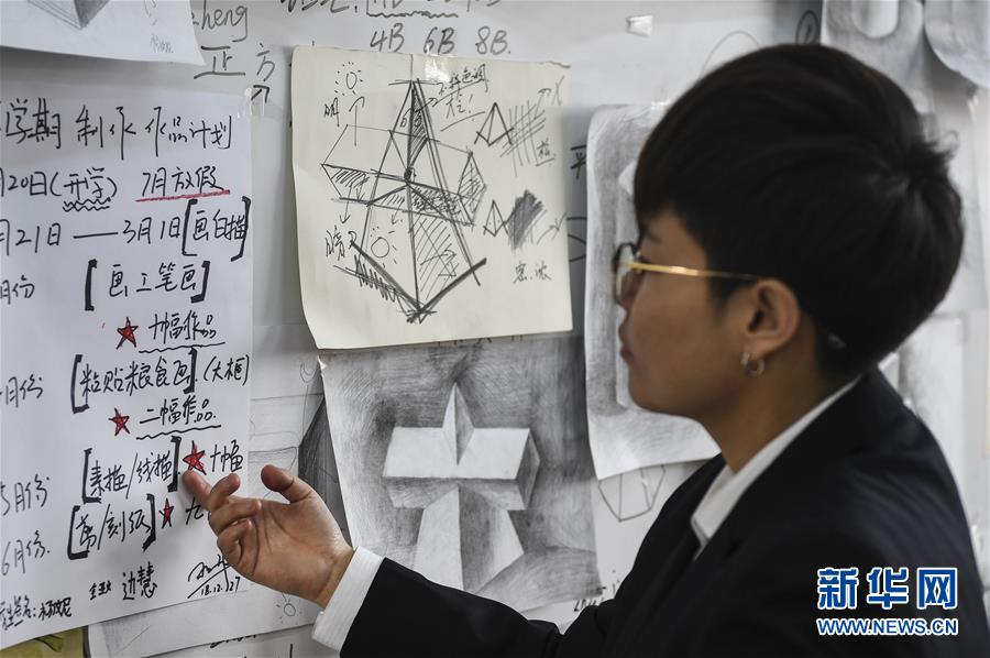 2月25日,王丹查看新学期美术教学计划。 新华社记者 陶明摄