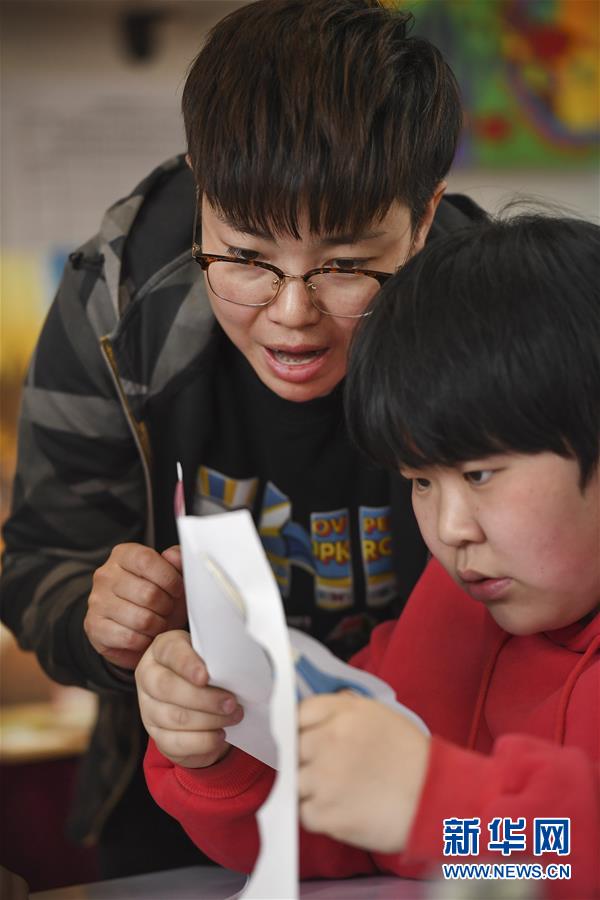 2月25日,王丹(左)在辅导学生剪纸。 新华社记者 陶明摄