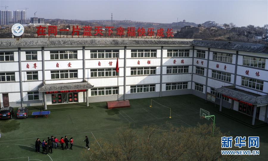 2月25日,王丹与学生们一起在校园里做游戏(无人机拍摄)。 新华社记者 陶明摄