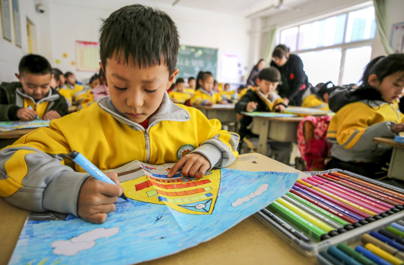 2月21日,河北省大厂回族自治县城区二小一年级四班的孩子们在绘制家乡美景。连日来,河北省多所中小学迎来春季开学。大厂回族自治县城区二小开展了以“画出我们最爱的家乡”为主题的“开学第一课”活动,孩子们在老师的指导下把对家乡的热爱倾注在手中的五彩画笔中,描绘出心中最美的家乡风景,抒发对祖国、对家乡的无限热爱。(新华社记者 李晓果/摄)