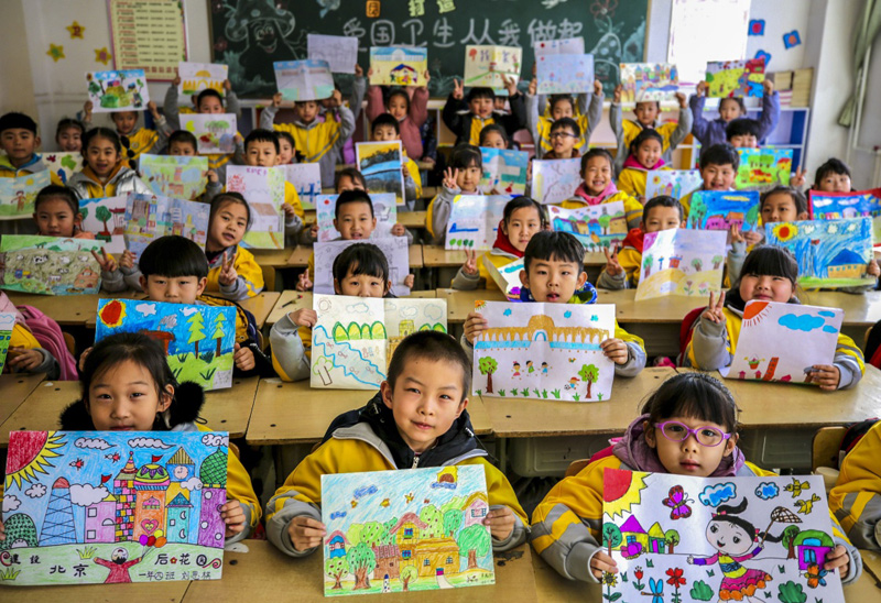 2月21日,河北省大厂回族自治县城区二小一年级四班的孩子们在展示自己绘制的家乡美景。(新华社记者 李晓果/摄)