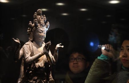 2月28日,观众在参观展出的展品。当日,《山宗·水源·路之冲——一带一路中的青海》主题展览在北京首都博物馆开幕。据了解,本次展览共展出文物四百余件(套),旨在向国内外观众展现“一带一路”中的青海。 新华社发(任超摄)