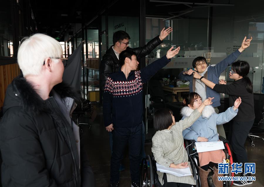 2月24日,在北京病痛挑战公益基金会办公室,导演梁婉云(右一)在指导演员们排练。新华社记者 金立旺 摄