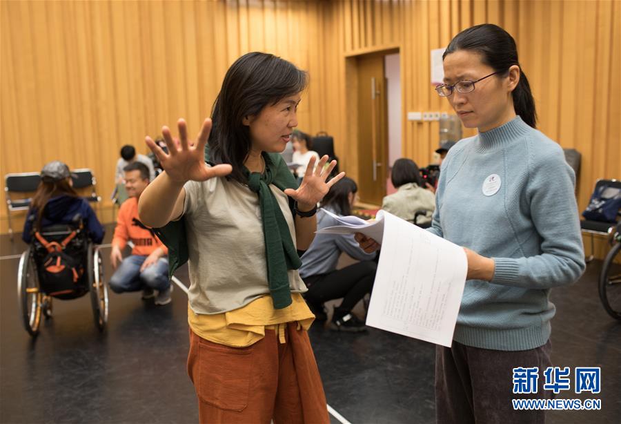 2月26日,在北京天桥艺术中心排练厅,导演陈美苹指导罕见病病友潘龙飞。 新华社记者 金立旺 摄
