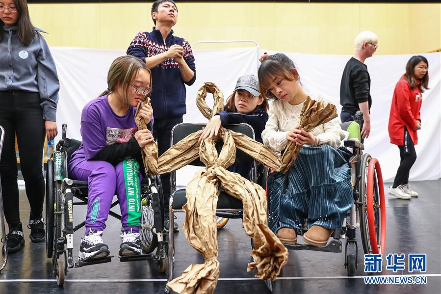 2月21日,在北京天桥艺术中心排练厅,罕见病病友丁原(前左)和潘龙飞合作进行肢体训练。新华社记者 张玉薇 摄