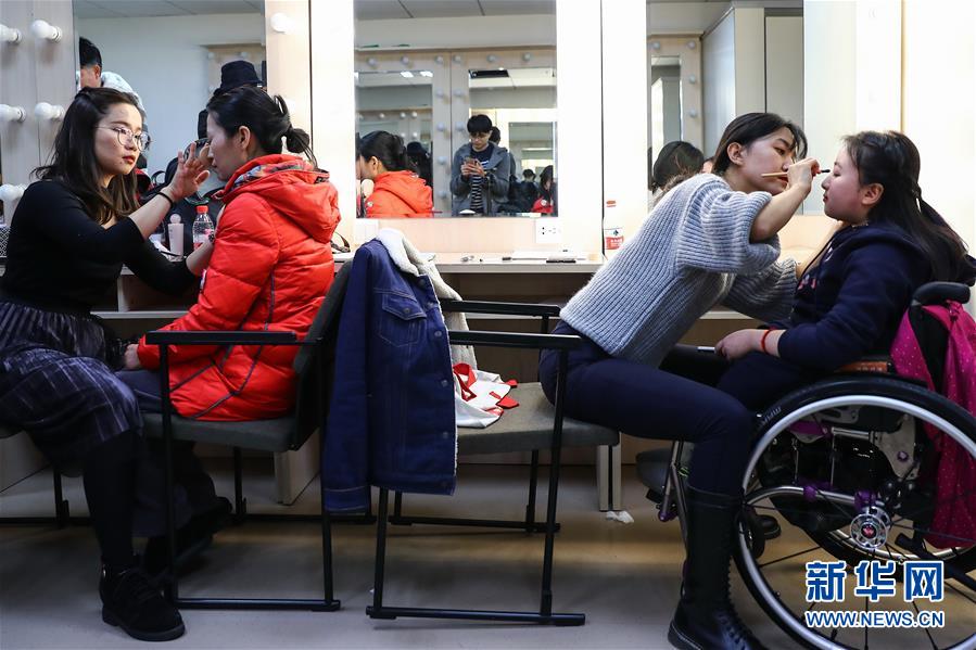 2月27日,罕见病病友蔡莉(左二)和崔莹(右一)在北京天桥艺术中心的小剧场演出前化妆。新华社记者 张玉薇 摄
