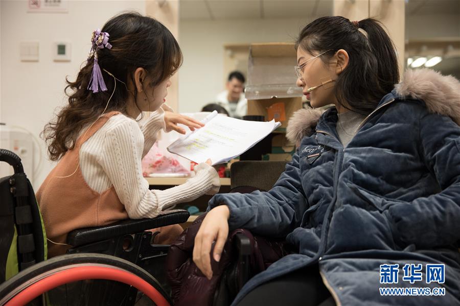 2月27日,在北京天桥艺术中心小剧场后台,罕见病病友尹元月(左)和巩晓寒在演出前对台词。新华社记者 金立旺 摄