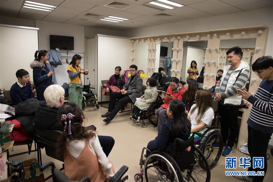 2月22日,在北京天桥艺术中心小剧场,罕见病病友们第一次来到舞台上走位排练。新华社记者 张玉薇 摄