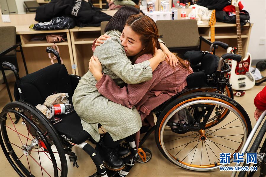 2月27日,罕见病病友程利婷(右)和黄静在北京天桥艺术中心的小剧场演出后相拥告别。新华社记者 张玉薇 摄