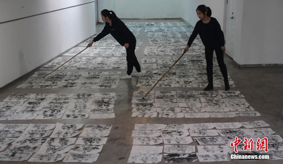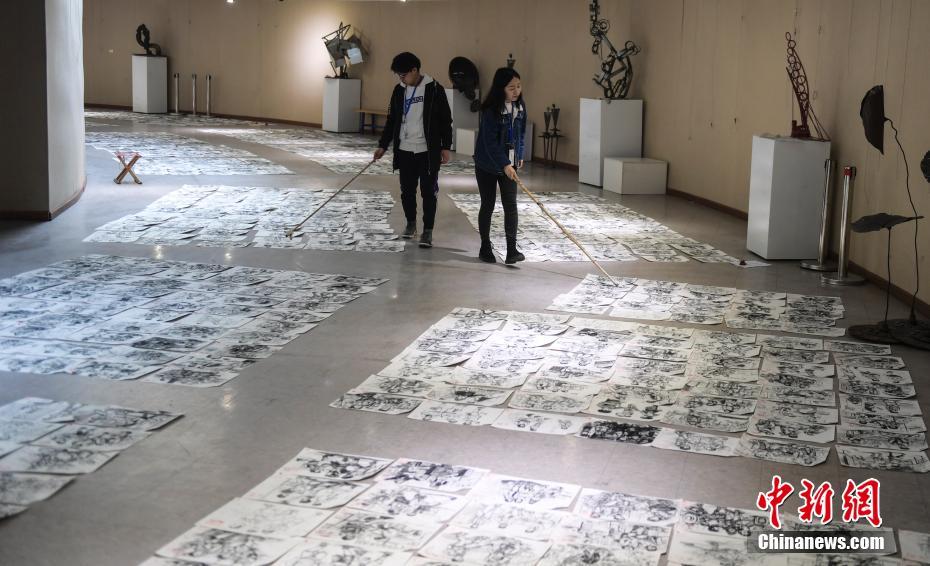 2月28日,工作人员手持竹竿排摆考生试卷。当日,山东艺术学院美术校考阅卷工作在济南长清校区进行,评委们手持竹竿对万余张考生画作评点分档,场面壮观。中新社记者 张勇 摄