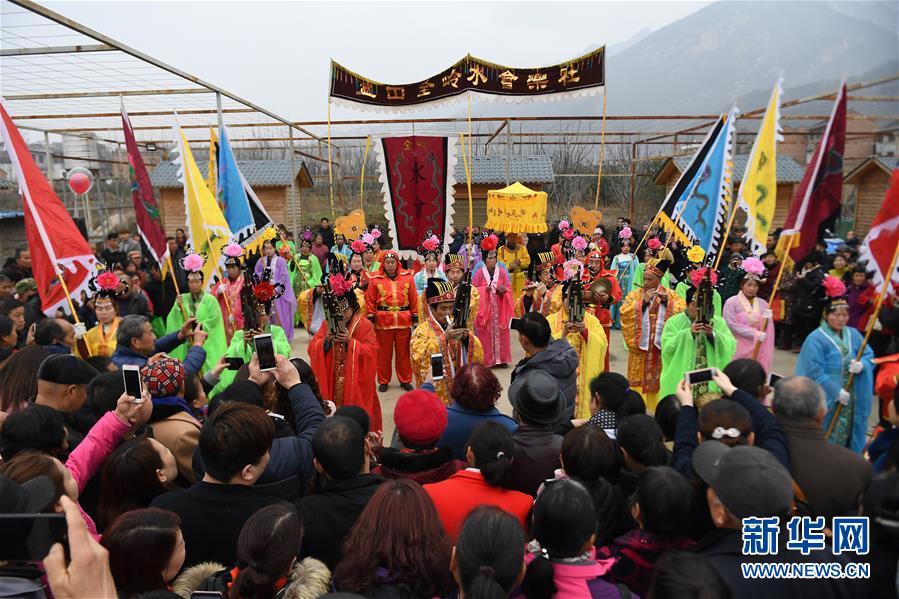 2月28日,民间艺人在陕西蓝田水陆庵古庙会上表演国家级非遗项目——蓝田普化水会音乐。 当日是农历正月二十四,陕西西安蓝田县水陆庵古庙会上人头攒动,古老淳朴的庙会吸引众多当地群众及游客前来参加。 新华社记者刘潇摄