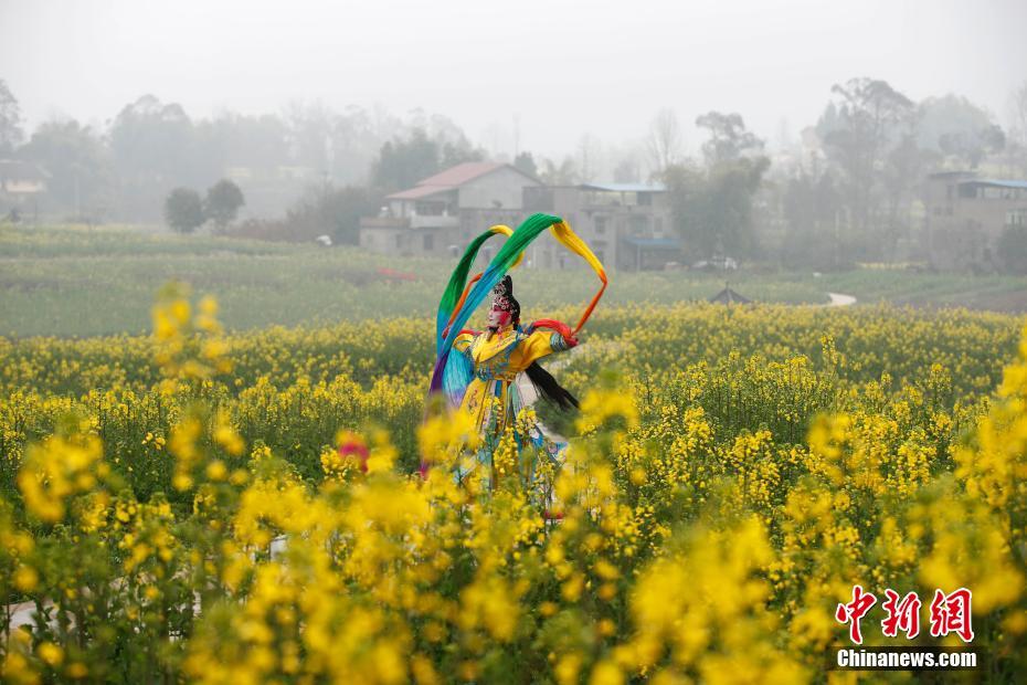 京剧爱好者着京剧戏服在油菜花海中演出。余鸿 摄